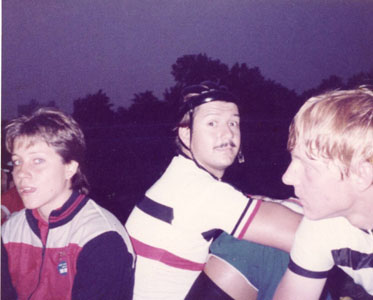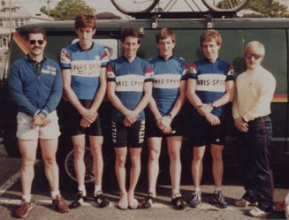 This was our team for the Tour of Long Island. I (left) was the mechanic, and Doug Hutwagner (right) was the manager. The riders were, left to right; Steve Weiler, Richard Minchik, Hewitt Thayer, Jim Lehane, and (not shown) Bobby Philips. Bobby (the one from Ireland, not Baltimore) had crashed and broken a few ribs so he went home before this photo was taken.