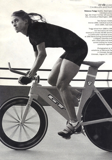 I didn't take this picture. Annie Liebowitz did; for a photo essay on Olympic athletes in Vanity Fair. I'll probably get sued if she finds out that I'm using it. Anyway I think it is a very cool shot of Rebecca Twigg. Twigg was a many-time World Champion in the pursuit. She must have been traveling in this area because she showed up at one of Vito's training races in Uniondale. Those races were run as one big field, no separate categories, so we got to ride with her. I remember that she had a very distictive pedaling motion. At the end of the race there was a break away up the road and Rebecca was one of those left to contest the field sprint. There were probably 50 men left in the peloton but it came down to Twigg and Jim Lehane at the line. The skinny little girl prevailed and Lehane had to hide his face for a few weeks. As usual, after the race, most of the group went over to Giuseppie's in Westbury for pizza and beer. Rebecca was with Leslie and Harvey Nitz. She was at least as shy off the bike as she was assertive on it. She sat there like a little mouse. After a while she loosened up but she still didn't have much to say. Uncharacteristicly, niether did Jim. |