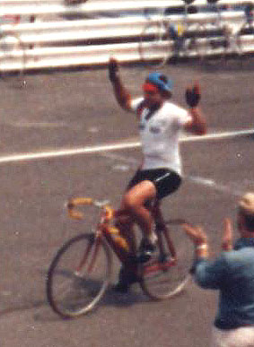Here is a picture of 1984 Olympic Silver Medalist Nelson "T-Bah" Vails that I took at the Kissena track. Nelson was a bike messenger from Harlem who cut his teeth as a sprinter on our local velodrome. Mitch and I once rode a 3-up match sprint against him. I wish I had a picture of that. Yes he has two legs; it is just the camera angle. I WISH he only had one leg. Maybe then we would have stood a chance.