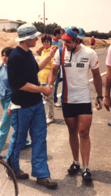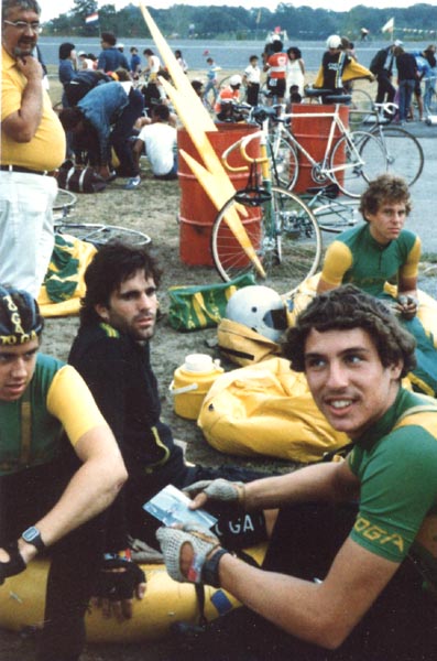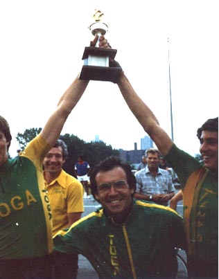 In those days Nelson rode for the Toga Tempo Thunder-Bolts. Toga was the top squad in N.Y.C. for many years. The sponsor was Gaylen "Lenny" Preheim (yellow shirt) who owned a Manhattan bike shop of the same name. Pictured here are Jimmy Keogh who was the team coach flanked by Brian Fucci and ????.