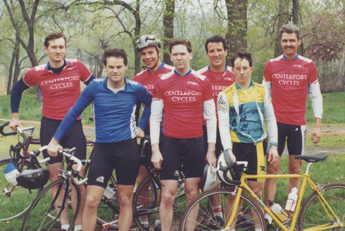 This a group of L.I.W.A ./ Centerport Cycles riders after a race in Prospect Park. Left to right: Scott Lenz, Charlie Kempner, Harry Slutter, Derrick Brayton, David Orelli, Thomas Feehan, and Ken Pritchard |