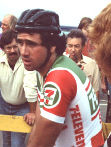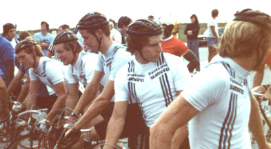 The Panasonic / Shimano Team circa 1980. Bruce Donaghey, Wayne Stetina, Dale Stetnia, Thomas Prehn and Ian Jackson (maybe?). Thomas Prehn recently wrote a really good book on bike racing tactics. OK, Wayne Stetina sent me a correction: 1981 Panasonic/Shimano team: that's Hugh Walton, not Thomas Prehn. It is Ian Jackson with his back to the camera.