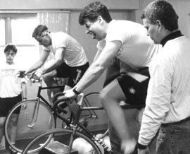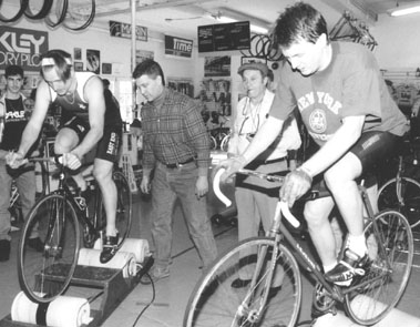 Here is Gregory Durovich (left) going against Jim Hettenbach. Pete Senia (with cap) is officiating. Success in roller races is dependant on the ability to pedal very quickly combined with a deep anaerobic capacity.