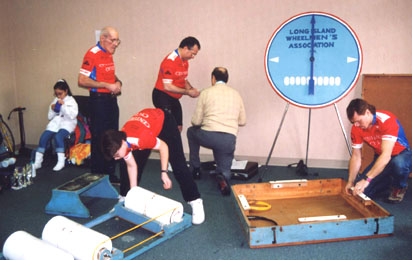 This shot shows the Long Island Wheelmans' roller racing rig being set up. It is the nicest set of racing rollers that I've seen. They were built in the 1950's buy a guy named Andy Hamel. Legend has it that Jackie Simes did a sub one minute standing start mile on these rollers. His opponent for that race was Pete Senia Jr.